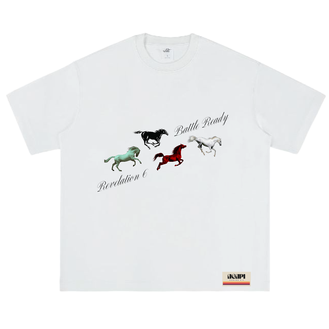 This tee is about the four horses in the Revelation 6 in the end times. They symbolize deception (white), war (red), famine (black), and death (pale). These things will come. Be ready for battle! Arm yourself with The Word!